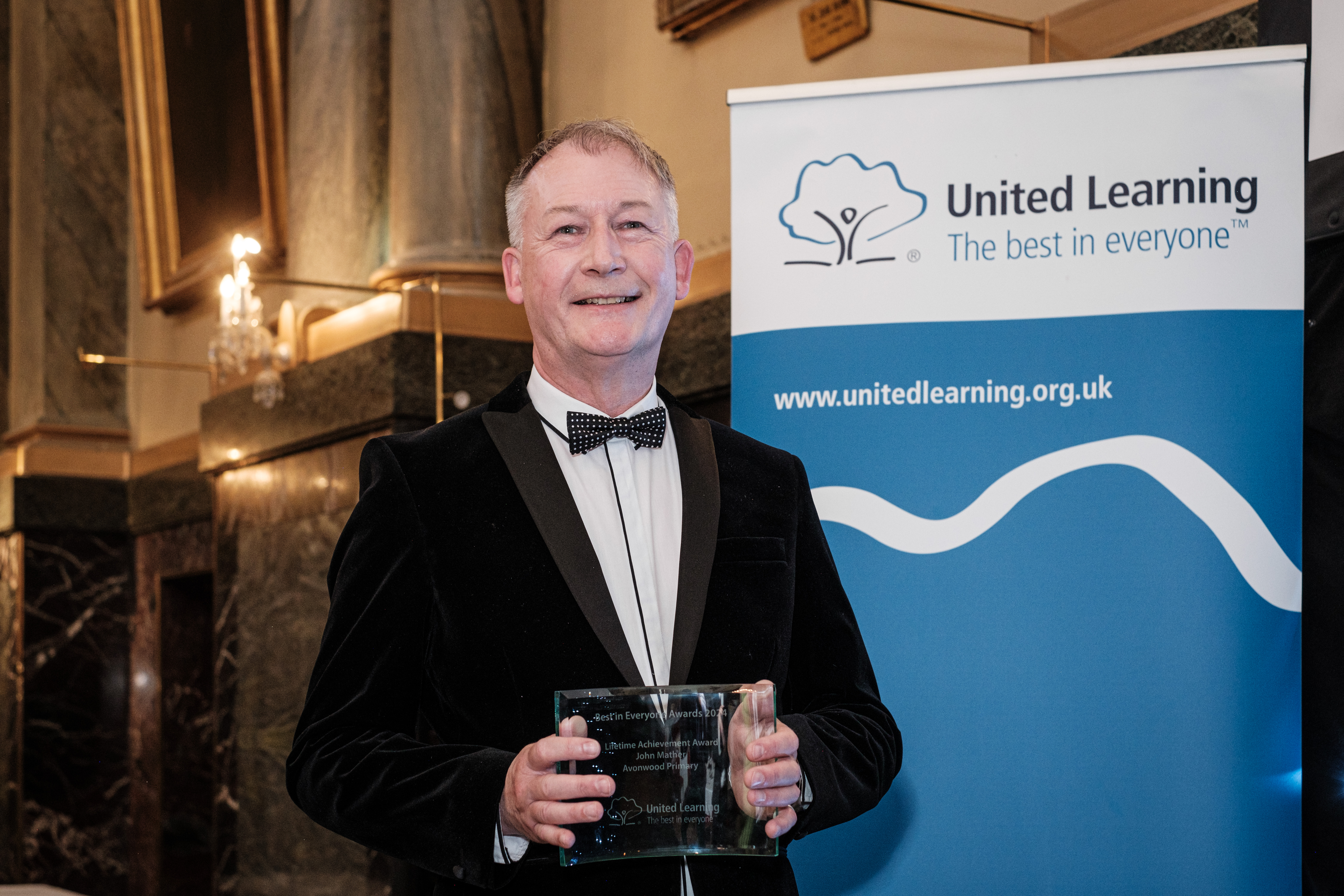 Avonwood Primary School is celebrating a member of staff, John Mather, for winning the ‘Primary Lifetime Achievement Award’ at United Learning’s national Best in Everyone Awards. John was commended at a magnificent black-tie gala held at the Cutlers’ Hall in Sheffield on Friday 21st June.